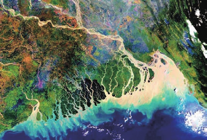 印度的母亲河——恒河与布拉马普特拉河(雅鲁藏布江)汇合后可谓波涛汹涌,宽度达到8千米,可是它在汇入孟加拉湾前分裂成了8条水道,每条水道的分岔数不胜数且游移不定。恒河的泥沙通过这些毛细水道在入海口淤积,形成了无数个沙岛。被河网划分得支离破碎的土地与沙岛已经难以分辨,它们与湖泊、沼泽一起构成了巨大的迷宫,水和陆的界线开始模糊,这就是多岛型的恒河三角洲。恒河三角洲的“顶点”距海500千米,“底边”宽达320千米,面积6.5万平方千米,是世界上最大的三角洲,优越的地理环境供养了超过3亿的人口。由于恒河三角洲海拔普遍不足10米,河口呈喇叭形,热带风暴来袭时潮水不易分散,很容易引起大面积洪水泛滥。海水入侵也让河网密集的恒河三角洲面临水土流失、岸线侵蚀的危险。
