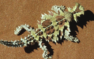 在沙漠严苛的自然环境下,棘蜥进化出了一种奇特的收集水分的方法。在棘蜥尖刺间的皮肤上,分布着数以千计的细小凹槽,这些凹槽直接通到蜴的嘴巴。当夜幕降临的时候,沙漠变得非常冷,空气中的水蒸气在棘蜥的身体上形成露水,这些露水最终顺着凹槽直接被送进棘蜥的嘴里。不仅如此,凹槽还像油墨纸一样,当棘蜥经过植物或动物身边时,会带走附着在这些动物身上的夜间露水,堪称是“盗水高手”。