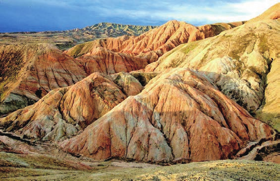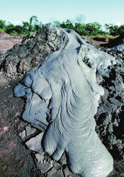 除了那些正在喷发的,其周围还有许多已经停止喷发的泥火山,它们呈丘状、垄状、漏斗状……千沟万壑,层峦叠复,红、黄、橙、绿,色彩斑斓。因此可见,在此之前曾经有过很大规模的泥火山活动。