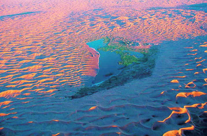 俯看月亮湖,只见湖光沙色,交相辉映;碧水蓝天,浑然一体,恍如梦境一般。月亮湖犹如一叶扁舟和一面明镜,集灵动、轻柔和明静于一身,充分展现出一种原始的、自然的、未经人工刻意雕琢的原生风貌。