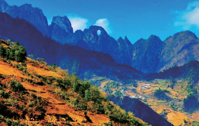 其实,并不是一弯明月,而是在怒江边海拔3500米以上的险峻山峰上自然形成的一个“圆洞”,早在傈僳族古老的大洪水神话中,它就已经存在了,傈僳语称之为“亚哈巴”,就是“石月亮”。