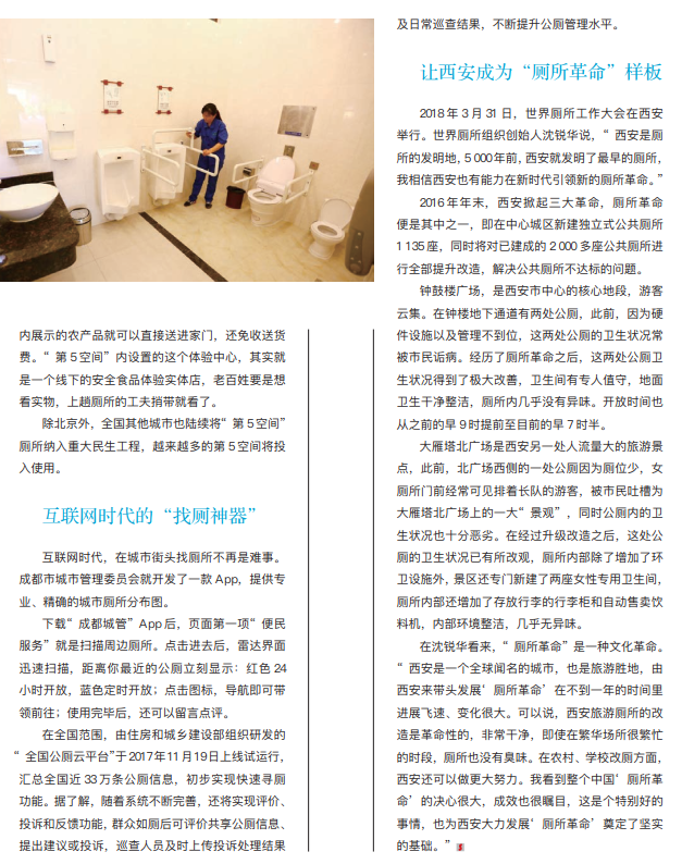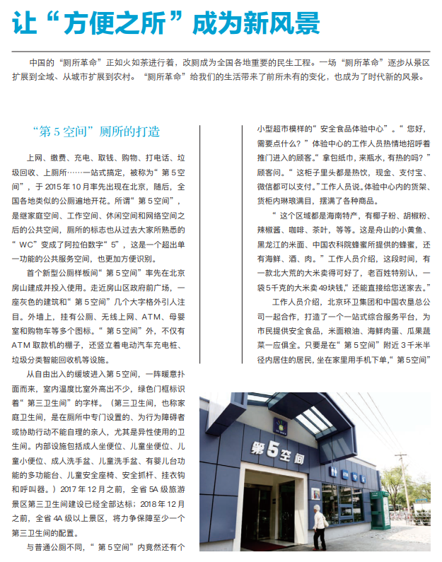 上网、缴费、充电、取钱、购物、打电话、垃圾回收、上厕所⋯⋯一站式搞定,被称为“ 第 5空间” ,于 2015年 10月率先出现在北京,随后,全国各地类似的公厕遍地开花。