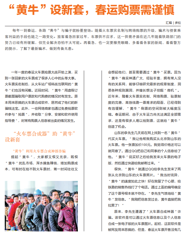 每年一到春运,各路“黄牛”与骗子就粉墨登场。随着火车票实名制与网络购票的升级,骗术与侵害乘客利益的手段也随之一路变化。