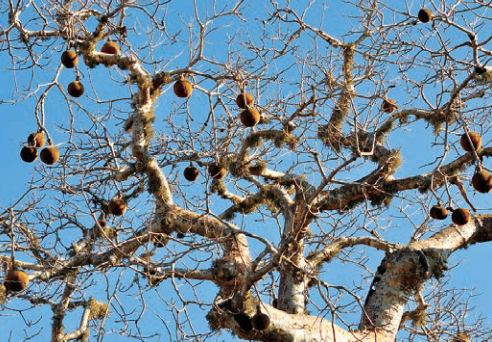 猴面包树的花很大,直径可达15厘米,雄蕊有数百个,集合成束;果实呈棒槌形,成熟时可长达30厘米。在旱季,猴面包树虽然落叶了,但是很容易看到树上悬挂着黄棕色的果实。把果实掰开,里面是白色丝状的果肉和块状的种子,据测定,其果肉富含钙和维生素C。果肉可以生吃,味道酸甜,或加水制成果汁饮用,也可以作其他食物的添加品,如加到牛奶中。