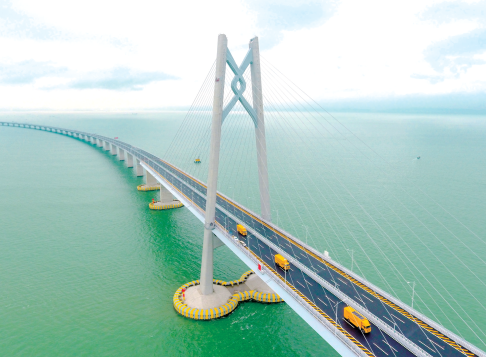 2018年10月24日,港珠澳大桥正式开通,横跨伶仃洋,东接香港特别行政区,西接广东省珠海市和澳门特别行政区,总长约55千米,是“一国两制”下粤、港、澳三地首次合作共建的超大型跨海交通工程。