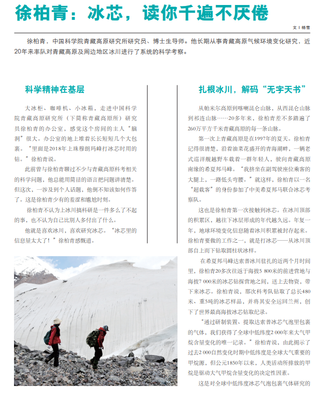 徐柏青,中国科学院青藏高原研究所研究员、博士生导师。他长期从事青藏高原气候环境变化研究,近20年来率队对青藏高原及周边地区冰川进行了系统的科学考察。
