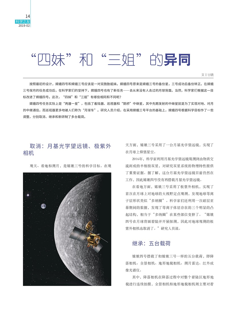 按照最初的设计,嫦娥四号和嫦娥三号应该是一对双胞胎姐妹。嫦娥四号原来是嫦娥三号的备份星,三号成功后备份转正。在嫦娥三号探月的任务成功后,在科学家们的坚持下,嫦娥四号也有了新任务——去从来没有人去过的月球背面。