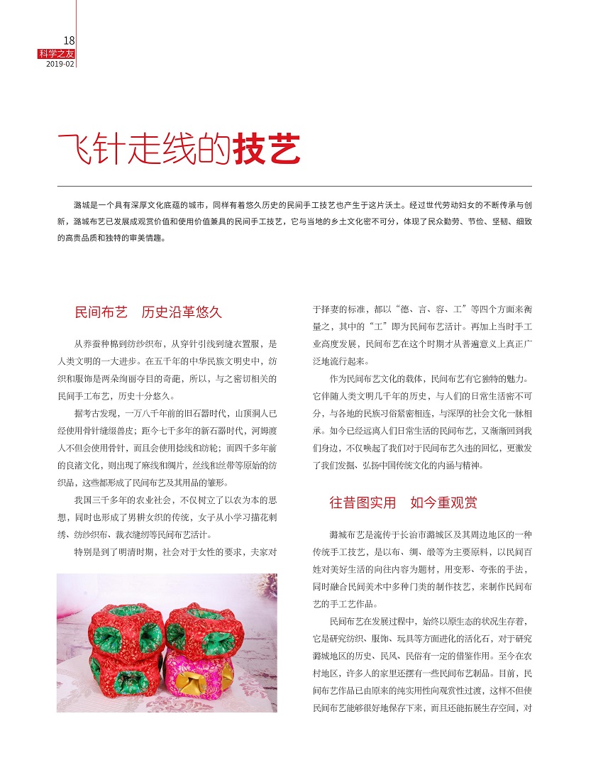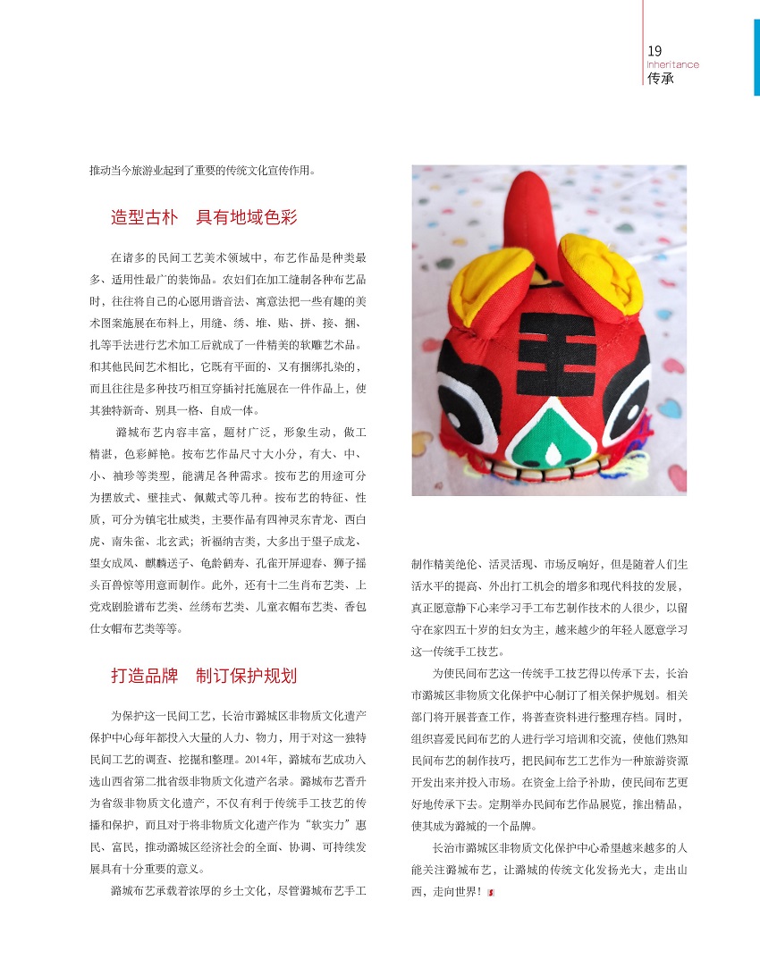 潞城是一个具有深厚文化底蕴的城市,同样有着悠久历史的民间手工技艺也产生于这片沃土。经过世代劳动妇女的不断传承与创新,潞城布艺已发展成观赏价值和使用价值兼具的民间手工技艺。