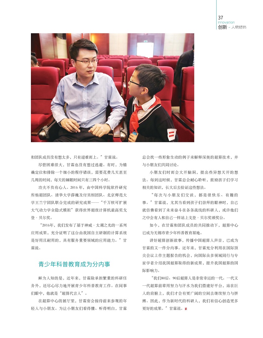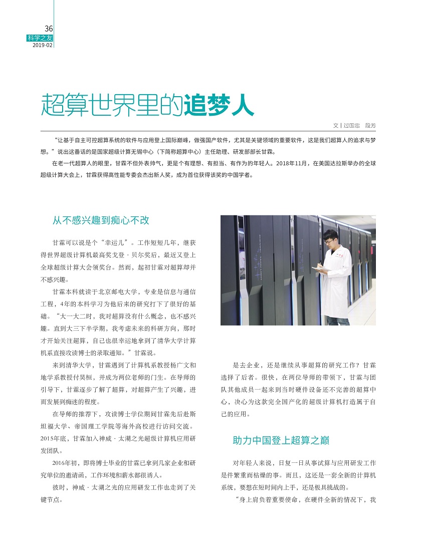在老一代超算人的眼里,甘霖不但外表帅气,更是个有理想、有担当、有作为的年轻人。2018年11月,在美国达拉斯举办的全球超级计算大会上,甘霖获得高性能专委会杰出新人奖,成为首位获得该奖的中国学者。