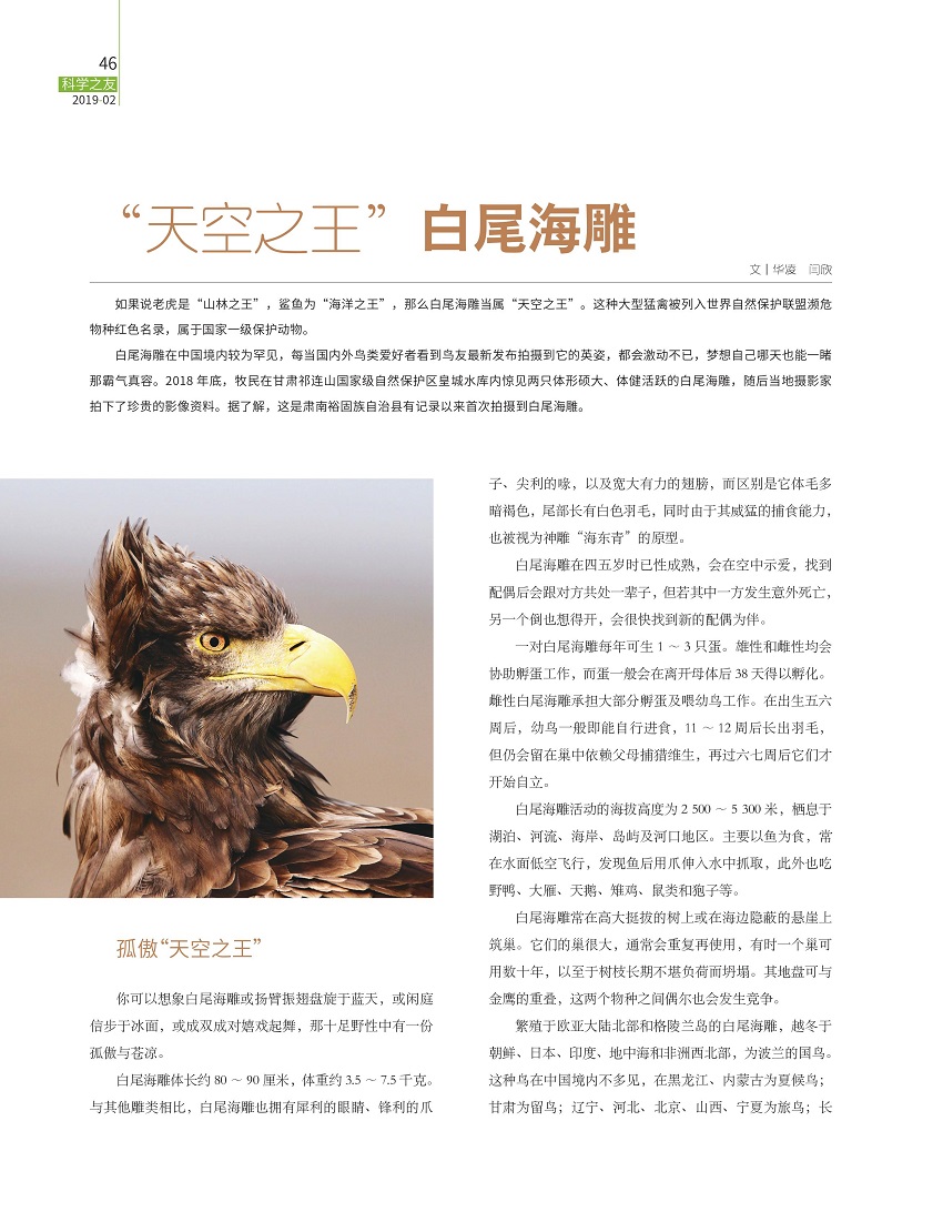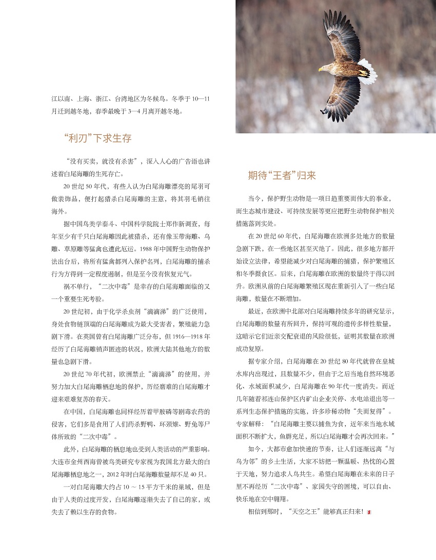 如果说老虎是“山林之王”,鲨鱼为“海洋之王”,那么白尾海雕当属“天空之王”。这种大型猛禽被列入世界自然保护联盟濒危物种红色名录,属于国家一级保护动物。