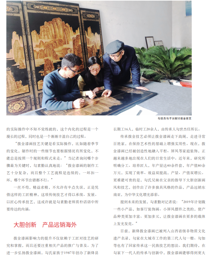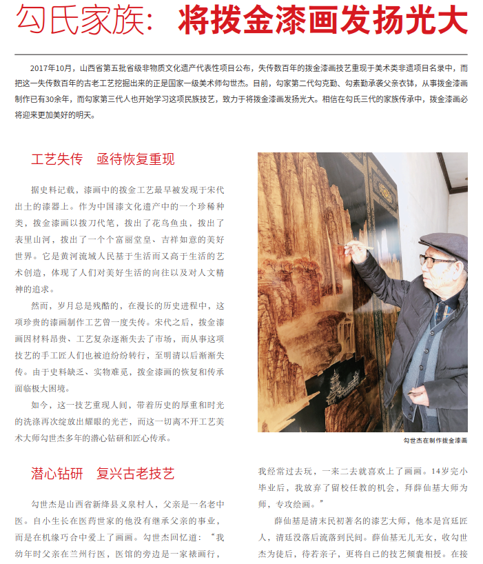 2017年10月,山西省第五批省级非物质文化遗产代表性项目公布,失传数百年的拨金漆画技艺重现于美术类非遗项目名录中。