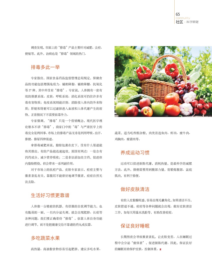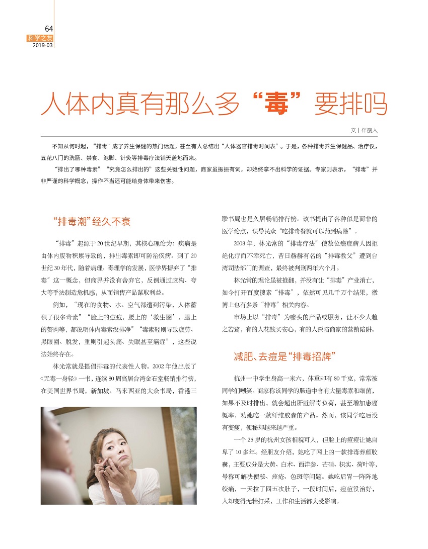 不知从何时起,“排毒”成了养生保健的热门话题,甚至有人总结出“人体器官排毒时间表”。于是,各种排毒养生保健品、治疗仪,五花八门的洗肠、禁食、泡脚、针灸等排毒疗法铺天盖地而来。