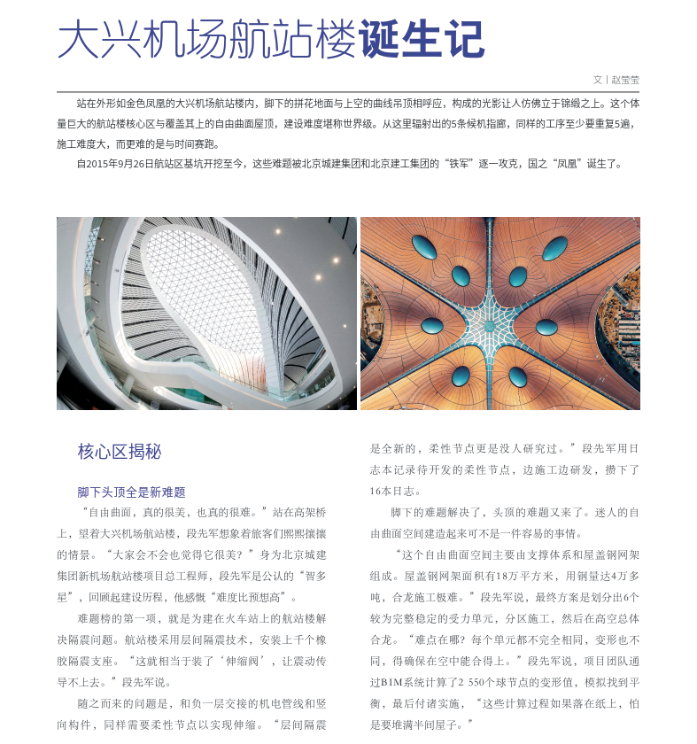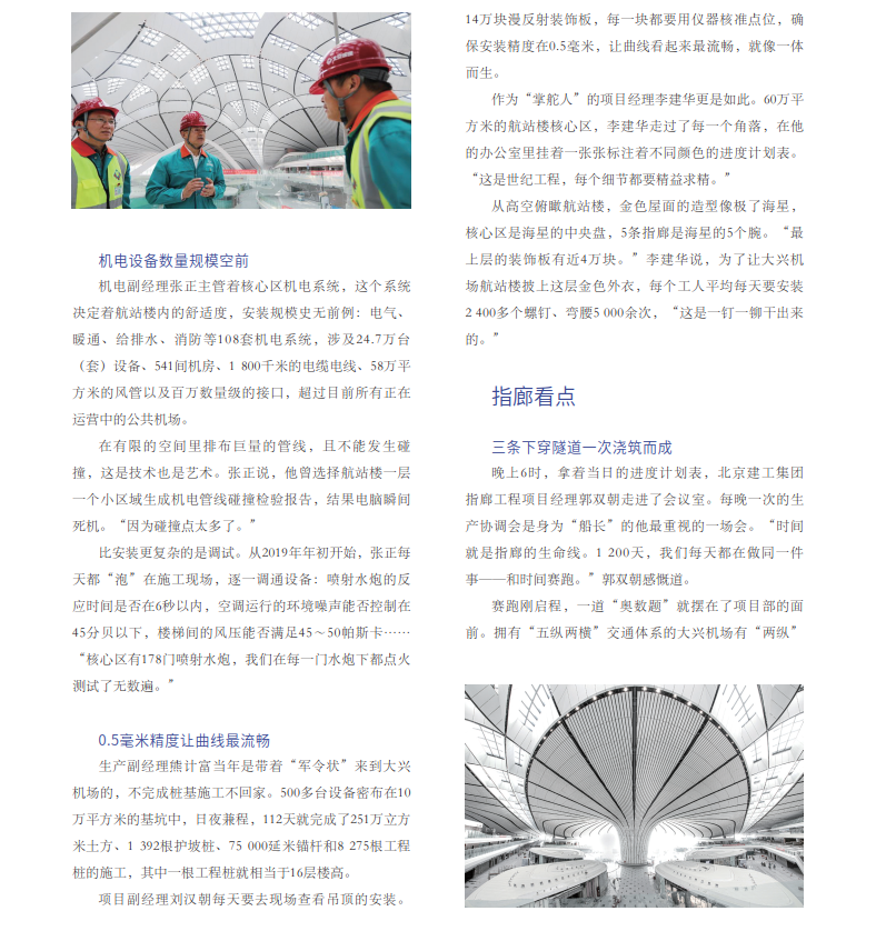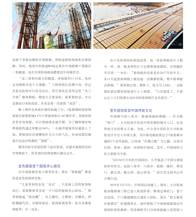 站在外形如金色凤凰的大兴机场航站楼内,脚下的拼花地面与上空的曲线吊顶相呼应,构成的光影让人仿佛立于锦缎之上。