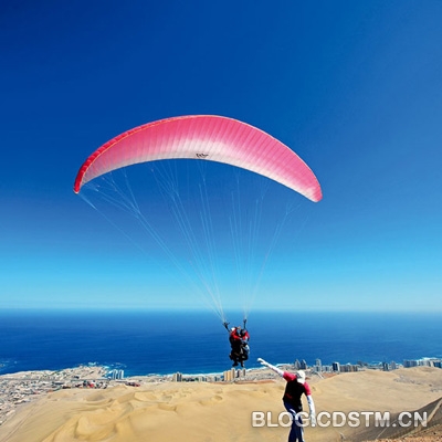 听旅店老板说,伊基克城北有座沙石山,经常有人从山上往下跳——不是自寻短见,而是乘风飞翔。由于终年阳光普照气候稳定,再加上陡峭的悬崖、广阔的大海、柔软的沙丘和上升的气流⋯⋯种种条件使伊基克成了南美大陆顶级滑翔伞场所。