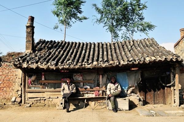 >> 右玉县铁山堡附近的村民在家门口晒太阳,这里的村落大都剩下了老人