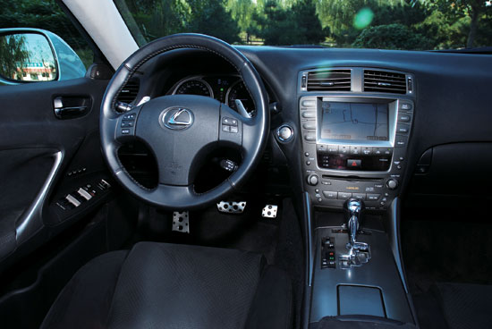 6挡变速器带手动模式,而且方向盘下还有换挡拨片,拨片的造型与法拉利上的拨片有异曲同工之妙,虽然我很少用它,但是有这个配置,让我的心理得到了进一步的满足。从技术规格上看,这款双VVTiV6发动机的最大扭矩输出转速较高,但是发动机低速时的扭矩输出仍然值得称道,尽管发动机低速时的动力不足以让它超越对手,但是变速器仍然愿意迅速而积极的换挡,并乐于将发动机保持在1500r/min左右的工作区间内,甚至在60km/h时就已经将变速器升到6挡,这显示了变速器对于发动机动力的信任,而且,更低的转速节约的燃油是德系对手们所望尘莫及的。发动机扭矩充沛的另一个例证是,当车辆静止时采用手动换挡模式起步,IS300允许变速器采用6挡。