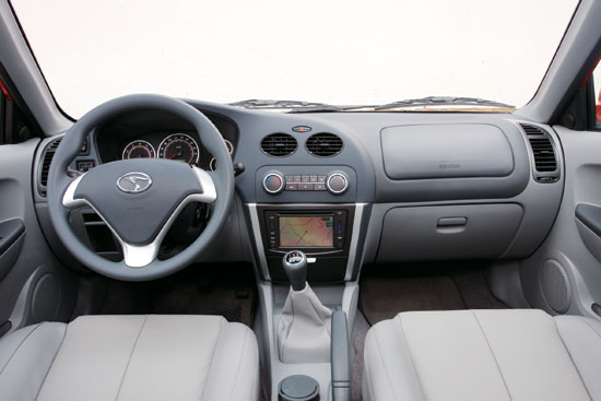 和同门兄弟蓝瑟一样,菱悦的中控台也采用符合人体工程学的弧面设计,中控台上所有开关位置都安排在伸手可及的范围内。与蓝瑟不一样的是,菱悦的中控台设计更加简洁、实用(菱悦共有5款车型,我们此次测试的是带有导航的顶配车型,布局与不带显示屏的标配车型有些不同)。上方为两个椭圆形空调出风口和空调调节装置,下方为导航/DVD显示屏,显示屏周围为调节收音机、CD、DVD以及导航的按钮。这种尽量简化按钮的设计非常实用,让人一目了然,方便操作。中控台上方采用黑色调,下方以及座椅和车门内框为灰色调,方向盘上还带有镀铬装饰,运动感十足。菱悦在细节设计上凸显人性化。空调旋钮综合考虑了客户转动时的力度以及美观,使其大小恰到好处,空调出风口的大小也兼顾了美观和快速制冷的要求。导航系统的操作方便、快捷,软件的更新也可以在4S店免费进行。DVD系统可供驾乘者在休息时观看,在松开手刹后屏幕便不再显示图像,以保证安全驾驶。唯一感到欠缺的是该显示屏位置较低,不方便观看。方向盘的人性化设计很好,带有专门设计的凸起,紧急打方向时能够有效地防止手打滑。烟灰缸可以放置在前排或者后排,为吸烟者带来很多方便。车顶灯还可以设置送你回家功能,晚上锁车后车顶灯自动延时10几秒钟,以使驾乘者看清道路。菱悦的真皮座椅很高档,座椅对人的支撑很好,坐姿舒适。高配车型的无钥匙启动系统是同价位车型中独有的,该系统只有在卡罗拉、颐达等更高级别的车型上才能看到。在智能钥匙里面还带有一把备用钥匙,在智能钥匙无电时,可以取出该备用钥匙进行启动。利用智能钥匙还可以遥控开启行李厢,为消费者带来了很多便利。