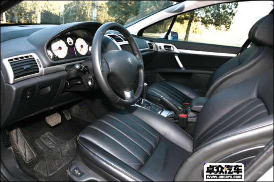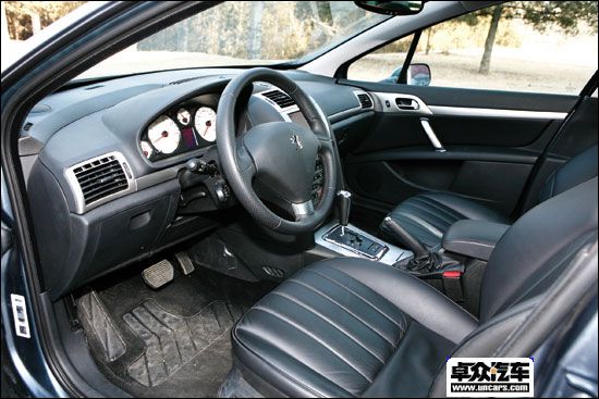 也许是为了做到表里如一,标致在407主销的2.2 L车型上采用了一款全黑的内饰风格,在点缀上钛银材料并搭配白色仪表圆盘后将整车的运动气质渲染到了顶点。全黑的真皮座椅上有意使用的条纹线条很有一股跑车的味道,打孔的真皮方向盘手感不错且利于抓握。