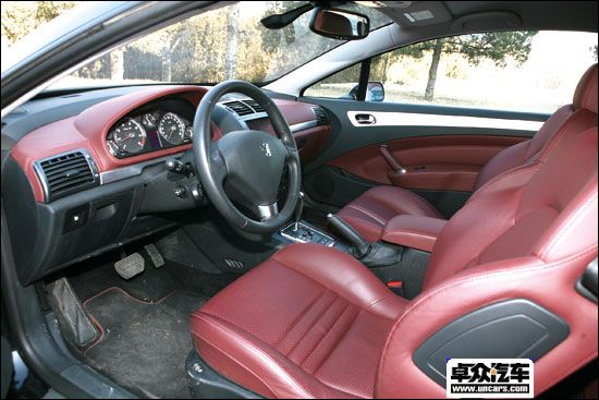 打开407 Coupé的车门,首先映入眼帘的便是与黑色内饰风格相搭配的暗红色真皮座椅及仪表板。这两个颜色的组合就像407 Coupé的造型一样时尚大胆,你甚至会微微感觉到暗红色真皮座椅因此而产生的一种肌肉质感,坐在这样的一个环境里,除了激动、兴奋之外,你还能去要求什么呢?407 Coupé的仪表盘与407和407SW上的有所不同,它采用了黑底白字的风格,这恰恰与另外两款车型仪表盘的色调相反,或许是觉得白色圆盘的出现会与内饰的整体风格产生不和谐吧。