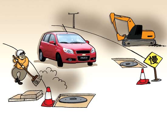 在经过破损或维修路面时,尽量避免加、挤、超车、躲避井盖等危险动作,只有减速慢行、沿直线行车,才能做到安全行车。