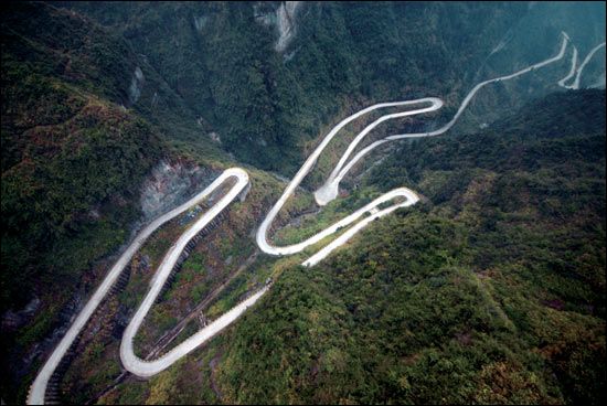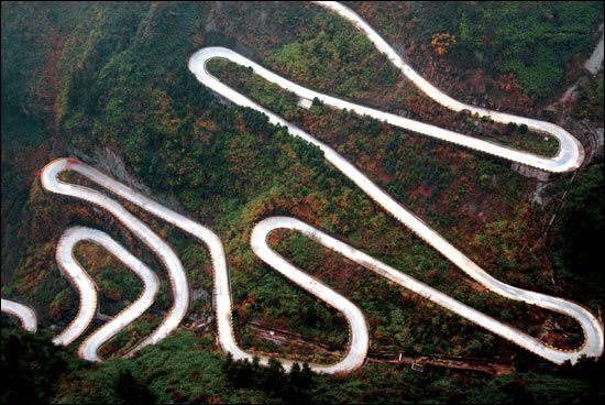 99道弯说的是这条盘山公路的基本构成情况。从山上俯瞰下去,它真的有如玉带环绕,弯弯相连,层层叠起,依山籍壁而直冲云霄。山路的险是有目共睹的,它以蜿蜒迂回山体绝壁之间而令人赞叹。盘山公路全长10.77 km,从标志门直达天门仙洞脚下,海拔竟从200 m急速提升至了1 300 m,其间有形式各异的弯道共计99个,180度的发卡弯绝对不在少数。