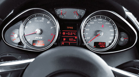 当然,您或许懒得听我废话,好吧,我不故弄玄虚,R8的最高时速是301km/h。这个数字意味着什么?或许我可以拿保时捷911的数据给大家当参考,除了911Turbo、GT3、GT2之外,大多数保时捷911的最高时速都没有超过300km/h,那么280km/h慢吗?有多少人一生中有机会去实现?实际上,300只是代表一种身份,301这个数字使得R8荣登300km/h俱乐部,有了这份荣耀等于武林公认奥迪R8成为不多的顶尖武林高手之一。最高时速是一种身份,那么瞬间加速却是决定胜负的关键,R8的0~100km/h加速需要的时间是4.6s,这个加速度对付像我这样的汽车疯子或许不够威力,但强烈的推背感足以让身边的小姑娘头晕目眩大呼小叫,当然,下车后需要我的搀扶也就在情理之中了,0~200km/h加速的时间是14.9s,我对此的体会并不深刻。但是,测试场的大直道上,不自觉中,时速表上200这个数字已然在指针之后。