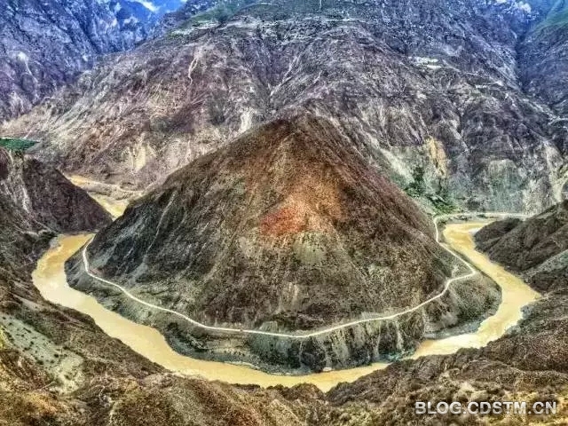 苍茫壮丽的金沙江大拐弯。金沙江是长江的上游河段,因盛产金沙得名,西起青海玉树,东至四川宜宾,全长2316公里。经过数百万年的河流侵蚀,金沙江沿岸形成了许多高达2000-3000米的壮观峡谷。在云南德钦县奔子栏镇和四川得荣县子庚乡交界处,金沙江在峡谷中转了一个倒“Ω”形大弯,在大地上勾勒出一条优美的曲线。