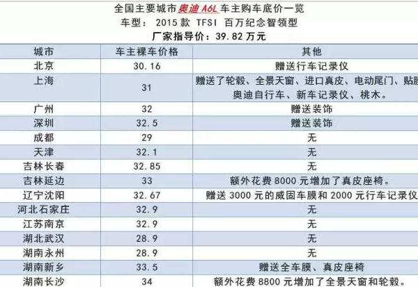 【底价购车】全国主要城市 奥迪A6L车主购车底价一览