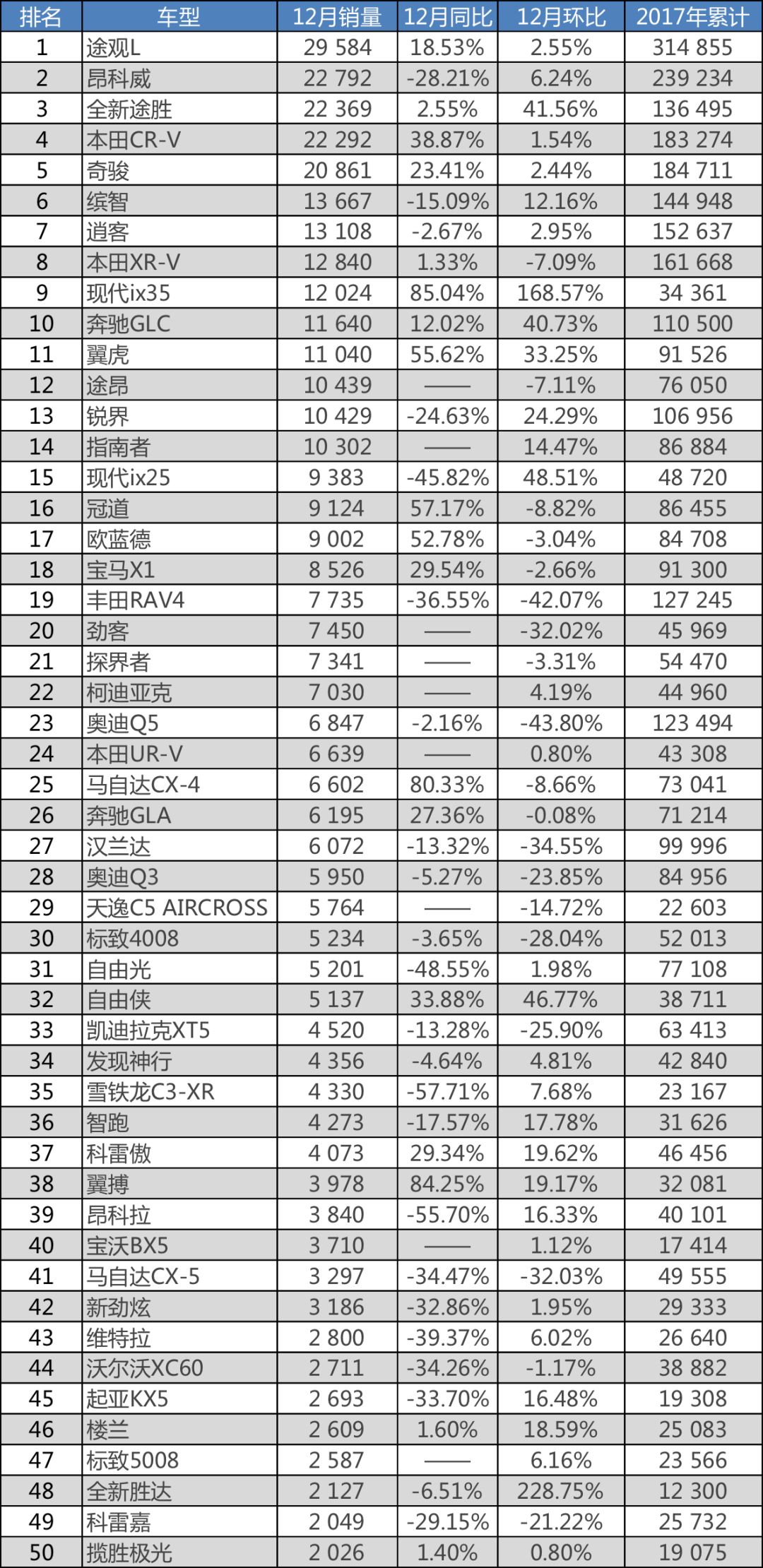 2017年12月合资品牌SUV销量排行