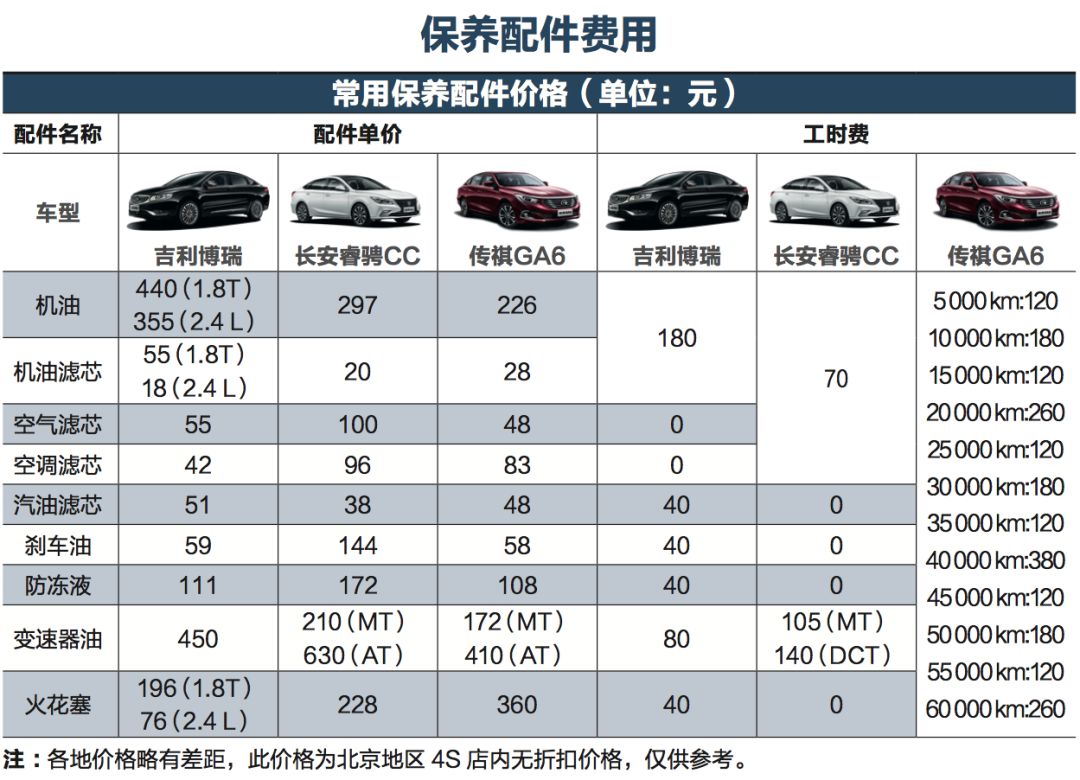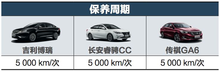 这三款车的保养周期是相同的,吉利博瑞在一些常更换的配件方面价格较高,尤其是机油的配件价格和工时费,机油是每次保养必须更换的,所以这很容易让吉利博瑞的整个保养费用上升不少,长安睿骋CC的工时费整体来说比较实惠,除了机油和变速器油以外,其余项目保养的工时费都是免费的再加上保养配件的费用大部分低于吉利博瑞,不出意外的话在整体的保养费用方面会更低,传祺GA6的保养工时费采用了套餐形式,套餐的工时费价格基本处于合理状态,配件的费用也和长安睿骋CC相差不大。