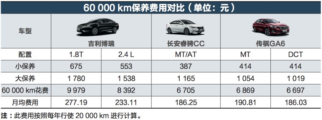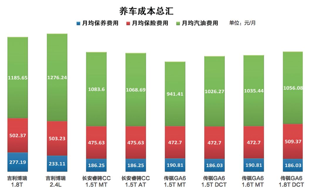 传祺GA6的整体表现是三款车型最实惠的,更低的油耗表现让传祺GA6的所有车型都有着不错的性价比,而长安睿骋CC在养车成本方面虽然比传祺GA6高,但也没有高出太多,基本属于同一个水平。反观吉利博瑞,不论是保养费用、汽油费用还是保险费用都要比其余两款车更高,所以在养车成本方面吉利博瑞是三款车中最高的。