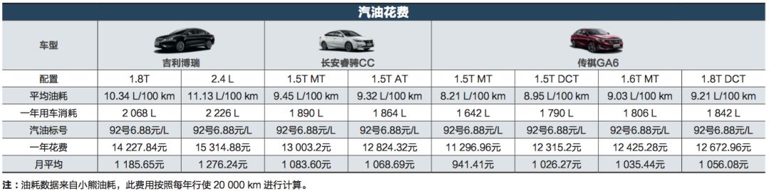 三款车的油耗来看吉利博瑞的油耗算是比较高的,但毕竟吉利博瑞的两款车型排量都不低所以在这方面也可以理解。所以对应每年的汽油花费也会更多,传祺GA6 1.5T排量的油耗是这些车型中表现最好的,汽油花费也相对更低。相比较来说,长安睿骋CC的油耗表现并不算出色,虽然从数字上看中规中矩,但综合排量来看的话这个油耗要比GA6 1.6T和1.8T排量的车型要差一些了。