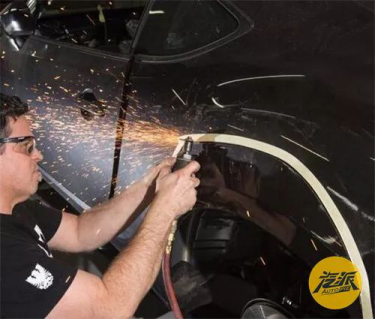 第二种宽体改造方式是“外抛钣金件”,这里指的是——玩家利用原厂车型的翼子板进行加工作业。首先,根据车主对宽体造型、外抛程度的需求,在原厂的翼子板切割出不同数量、不同长度的缺口,这样就能使得金属钣件有了空间的延展性,再以焊条与乙炔,将缺口补平并打磨焊点,这样就增加了钣件的面积,从而达到宽体改造的要求。