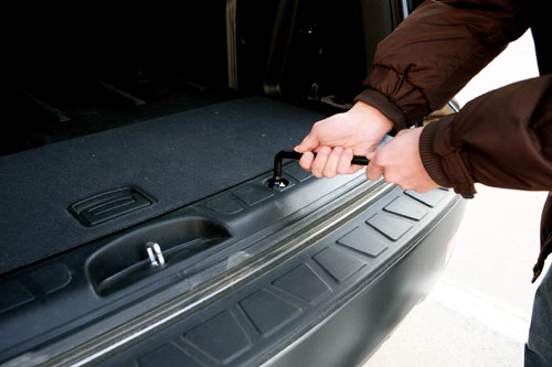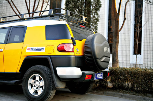 由于某些车辆特殊的使用要求,备胎被放置在车外固定,采用外挂方式固定备胎。多数越野车或SUV车型把备胎垂直地面外挂于后门或平行地面悬挂在汽车底盘后轮传动轴之后靠近后保险杠位置;有些MPV车型为了扩大车内空间也会把备胎悬挂在底盘后部;还有些特种车辆会把备胎平放在车顶固定,以上这些都属于外挂式备胎。这里将介绍的是使用固定在底盘上的外挂式备胎的操作步骤,以起亚霸锐车型为例,主要步骤包括: