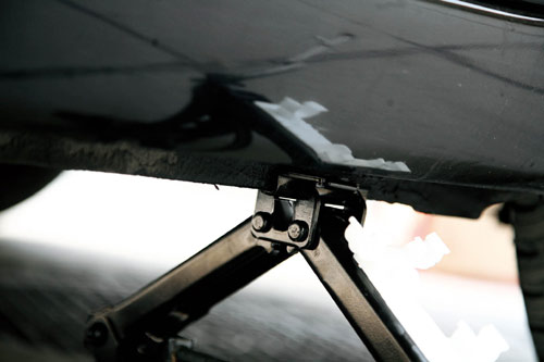 4.使用千斤顶举升时,应该选择正确的支撑位置。不能用千斤顶支撑保险杠、侧围、底盘横梁、下摆臂等部位,否则容易损坏车辆。支撑时还要避免千斤顶接触到制动管路、燃油管路、其他电器线路或零部件。