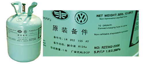 目前普遍采用的制冷剂类型为R134a,它的主要成分是四氟乙烷,分子式CH2FCF3。R134a的特点是不含氯,对大气臭氧层不产生破坏作用,更加环保。而且R134a具有不易燃易爆、无毒、无刺激性和无腐蚀性的特征,具有良好的安全性能。R134a的传热性比传统制冷剂R12好,因此可以大大减少制冷剂的使用量。