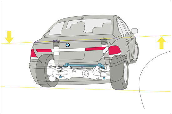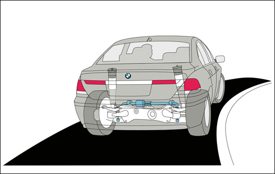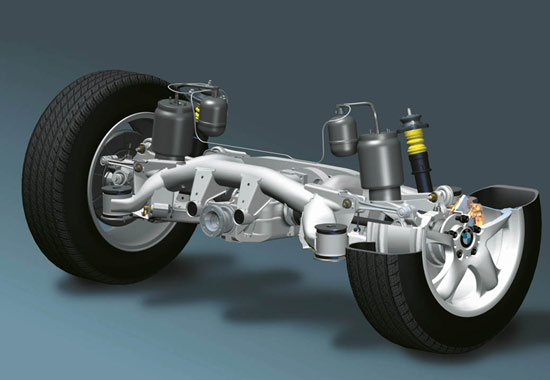 另外,对于大型轿车或SUV车型,装载大型货物或乘坐多人会导致车辆尾部下沉,宝马的电控减振系统可以通过集成到后桥总成的气缸充气来提升底盘的高度,以此抵消掉可能造成问题的趋势。气压由电动控制的辅助压缩机维持,压缩机独立于发动机运转,并可以根据需要进行单独调节。