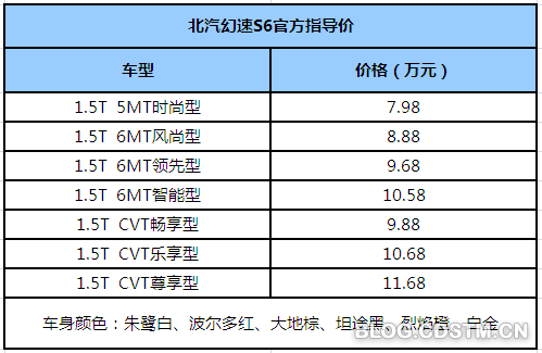 共推出7款车型与6种车身颜色可供选择。北汽幻速S6是北汽幻速S2/S3的基础上形成的,性价比颇高。