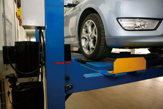 1.完成维修前的检查,就可以把车辆停放到专业四轮定位台上。目前使用的四轮定位仪器为无线传感器型,比老式拉线式测量和有线传感器式的四轮定位仪在测量精度上有很大提高,操作系统也更加简洁。完整的四轮定位系统包括传感器、发射器、主机、工作台和专业辅助工具。