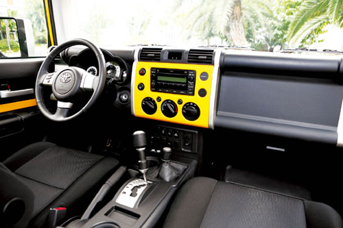比起外形设计,FJ酷路泽的内饰显得更加原始,黑色的内饰颜色保留了越野车的原始气息,但中控台与车身同色的亮丽材质的应用,又增加了时尚感。车内几乎所有的按钮甚至是车门把手都被刻意放大,这样能够保证驾驶者在戴着手套的情况下也能够轻松操作。豪华的舒适性配备在这里很难找到,就连驾驶席座椅都采用了手动调节,更不用说什么GPS之类的电子系统了。如果非要寻找的话,可能只有音响系统能够当之无愧。车顶夹层内独特的顶置扬声器以及车后行李厢内的低音扬声器,则都是越野车型上并不多见的配置。FJ酷路泽的内饰布局体现了一股浓烈的追求原始操控性能的气息,所以只有中控台亮丽的饰板以及遍布车身的扬声器这些只会在视觉和听觉上带来享受的舒适性配置被保留下来,丰田确实煞费苦心。