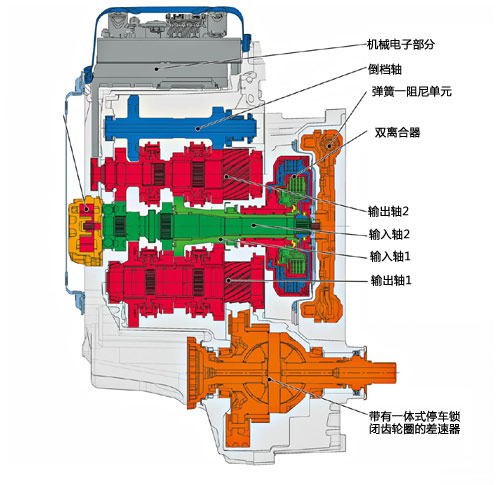 ●DSG变速器采用2个离合器和6个前进挡的传统齿轮变速器结构作为动力的传输部件。变速器内部装有2根同轴心的输入轴,1挡起步时离合器1接合,通过输入轴1将动力传输到1挡齿轮,再输出到差速器。此时离合器2是分离状态,实际上并没有动力在传递,只是预先选好挡位,为接下来的升挡做准备。变速器进入2挡后退出1挡,同时3挡则预先接合。