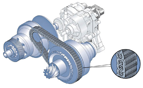 液力扭矩传感器同时确保链板始终适当地张紧,并确保扭矩在传输时不会产生滑动。链条在V形带轮的更内侧或更外侧运转,在各种行驶状态中产生理想的无级变速。链条由1 000多个链节和75副链销构成的新设计实现了最大程度的灵活性和大扭矩的动力传输。