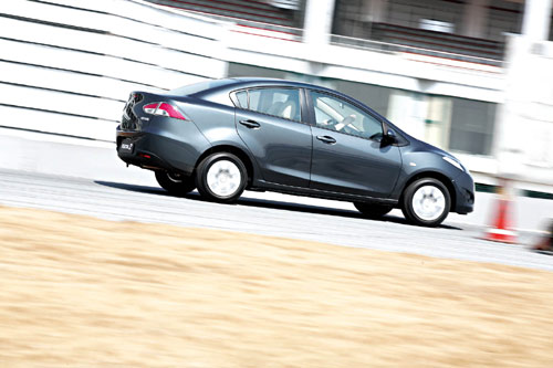 试驾中的劲翔配备了4挡自动变速器,在整体调校上与两厢车型一致,些许的遗憾是变速器没有随新款发动机的推出而匹配成技术含量更高的自动变速器,而且手动变速器配置的劲翔也没有出现在我们的视野中,看来长安马自达为下一步市场策略埋下了伏笔。试驾特别选择在赛道进行,三厢车的设计似乎与激烈的赛道驾驶不太匹配,但劲翔目标定位于年轻、富有活力的精英一族,良好的驾控感受是长安马自达要通过劲翔传递给这一消费群体的。布置在接近车身四角的车轮,使用了185/55 R15大尺寸轮胎,很大程度上提高了劲翔在高速行驶时的抓地力,马自达的3H高强度防撞和吸能式车身结构以及ABS、EBD、前排双安全气囊等安全装备都让我更加安心和坚定的加油,不断把转速表指针拉向红线。前麦弗逊独立式、后扭转梁半独立式悬架稳定了车身的行驶姿态,转向时的侧倾程度被控制在有效范围之内,只是在高速过弯时劲翔增加的尾部会使车身后部的负担加重,需要驾驶者不断调整转弯角度。
