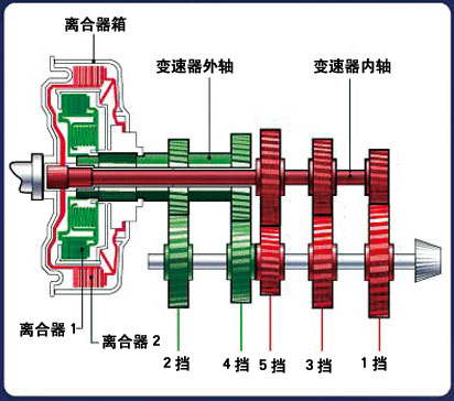 双离合器变速器,顾名思义,就是一台变速器使用了两个离合器,各离合器单独运转,一个离合器控制奇数挡位,另一个离合器控制偶数挡位。当汽车正常行驶时,一个离合器与变速器中的某一挡位相连,将发动机动力传递至驱动轮,与此同时,控制单元根据车辆行驶速度和发动机转速对驾驶者的换挡意图进行预先判断,“预见性”地控制另一个离合器与变速器中下一挡位的齿轮组相连,但此时仅处于“预接合”状态,离合器仍处于分离状态,尚未进行任何动力传输。换挡时,第一个离合器断开连接,同时第二个离合器将之前预连接的变速器中下一挡位的齿轮组与发动机接合,进行下一个挡位的动力传输,从而不会出现动力中断的状况。除了空挡之外,双离合器变速器中的一个离合器总处于接合状态,另一个离合器总处于断开状态。