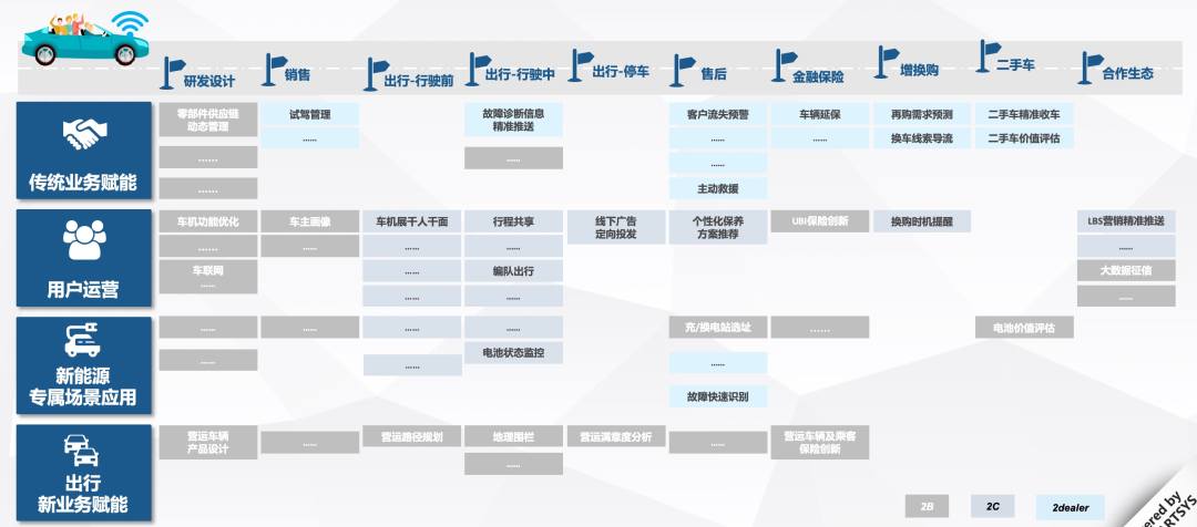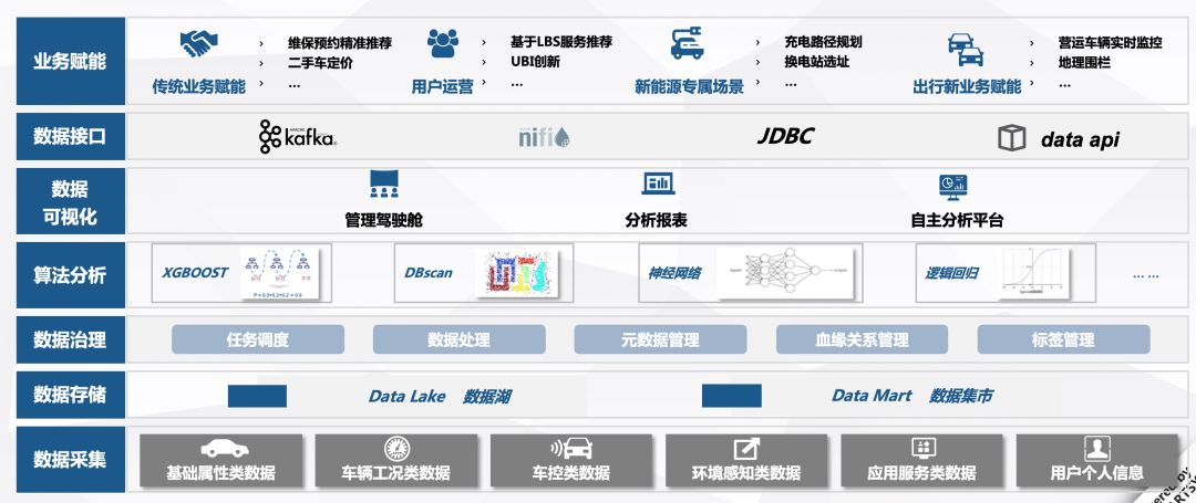 这些场景中,我们用得比较多的比如通过车联网做试驾管理,做车辆分析来支持二手车和延保业务的推荐,做故障和电池的诊断,做车辆远程诊断和救援等服务的实时响应,做用户画像等,这些场景的价值基本已经固定了,难以突破,并且这些场景在一定程度上还比较零散,尚未形成体系,更大的问题是场景都分散在不同的部门手里。