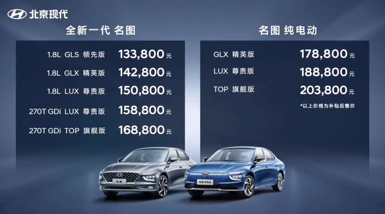 2021年3月1日,北京现代全新一代名图上市,这次名图的换代共上市8款车型,其中包含五款汽油版和三款纯电动版车型。汽油版车型的售价为13.38万-16.88万元。纯电动版车型的售价为17.88万-20.38万元。这一次全新一代名图的不仅是它自身的革新,更承担着整个现代的希望。