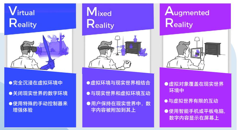 MR与VR、AR同属于现实增强技术,但VR是纯虚拟数字画面,AR是虚拟数字画面加上裸眼现实,而MR是数字化现实加上虚拟数字画面。从概念上来说,MR是VR与AR的进一步发展,该技术通过在虚拟环境中引入现实场景信息,在虚拟世界、现实世界、用户三者之间传递互动,以增强用户的体验感。