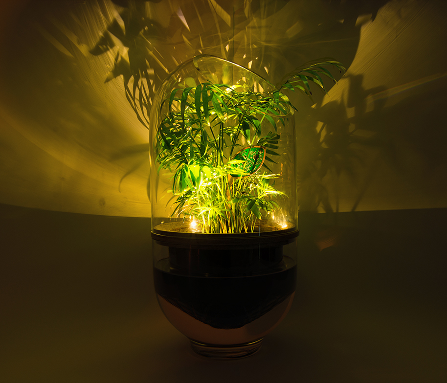 荷兰设计师厄米·范·奥斯的设计团队和科技公司Plant-e联合开发了这款依靠生物提供电能的创意灯Living Light(生命之光)。该产品采用植物微生物燃料电池(P-MFC)技术,利用植物的光合作用为具备产电能力的微生物持续提供营养,再通过插在土壤里的电子元件将微生物产生的电能源源不断地输送到LED上,让其发光。Living Light的开关就是植物的叶子,用户只要用手触摸叶子,就能点亮LED。Living Light适合放在床头当睡前阅读灯,也可以作为氛围灯,让柔和的灯光映照着生机勃勃的绿叶,为家居环境增添一番意趣。