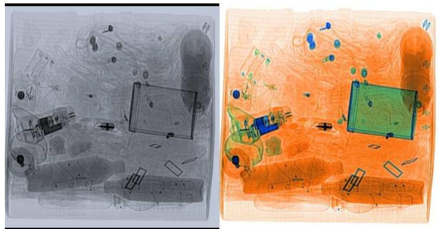 可不只是好看,这个功能是有实际安检意义的。从上面单/双能透视成像图像的对比,不难看出,双能图像的分类着色使不同物质更容易区分,有效降低了辨识难度,对于提升查验准确率有着非常显著的效果。你看下面这个图。