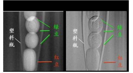 你看这张 X 射线灰度图,衰减图像无法区分的红豆和绿豆,而在相衬图像中有了明显的差别。